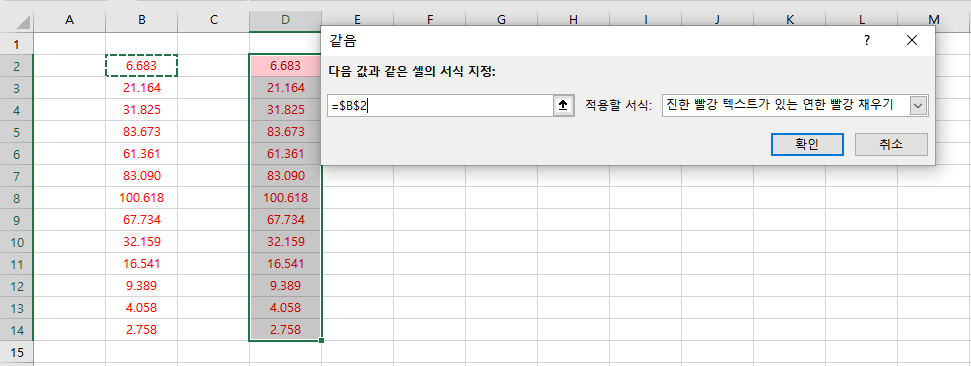 3. 조건부 서식 > 셀 강조 규칙 > 같음 클릭