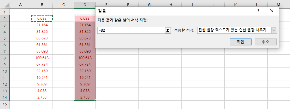 다음과 같이 데이터가 같을때 빨간색으로 채워지고